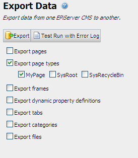 To deploy content and page types to a production site and have them registered automatically we recommend the export / import functionality of EPiServer CMS. Open your development site in a web browser and enter admin mode. On the Admin tab click Export Data. Check the options that are correct for you (in the sample image we are simply exporting a single page type, “MyPage”).