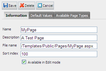 If you receive an error when trying to create a new page from one of the imported templates, check that the File Name property under the page settings in Admin mode points to the correct path. Commonly the path is set to the root folder during an import and the path might need to be changed so that it matches the templates actual placement in the folder structure.