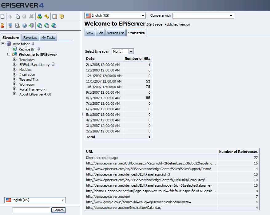 Do you have a large team of editors working together on the same content on your Web site? Some of the editors may be infrequent editors who only work with EPiServer CMS occasionally and don't have it as part of their main tasks. The statistics function in EPiServer CMS makes it easy for editors, especially infrequent editors, to quickly and easily find out if a certain page has been visited, when it was visited, and even how visitors reached the page. This is often adequate information to motivate the editor to keep working with the content on the page.