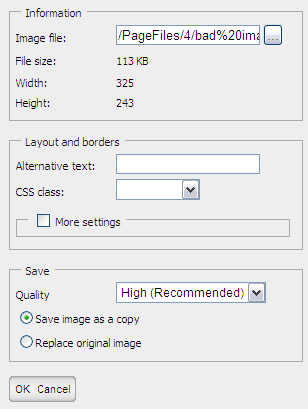 In the sample above I've uploaded an image that is too big for the page. Depending on how the page is designed the image may then "push" the left and right columns to the sides and ruin the layout. In this case the central part of my image should be an air balloon, but it's almost completely hidden behind the right list. In previous versions of EPiServer I could have changed the size of the image, but that's not what I want to accomplish. I want to focus on the balloon.