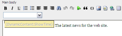 Now click OK. You will see your Dynamic Content Plug-In displayed on the page in the MainBody editor and it should look something like this: