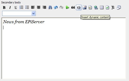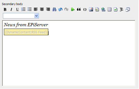Once deployed and configured, the dynamic content control is very easy to use. In the following example, we want a blog feed from ‘EPiServer World’ to appear in the secondary body of a standard page (EPiServer CMS sample templates).