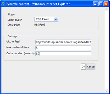 As an example of how dynamic content can be used, we have developed a dynamic content control called ‘RSS Feed’, which can be used to show the content of external RSS sources such as news papers or blogs. This control makes it possible for editors to insert news feeds on any part of the web site, making the web site update automatically as new items are published in the external RSS feeds.