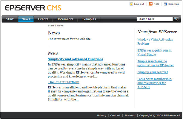 After the page is saved, the news list appears on the web site. The page will now be regularly updated with content from the external news feed.