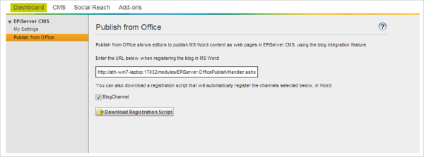 All you need to do is to install the Add-on from the Add-on Store, define the channels that should be available for office users - and map them to appropriate page types / properties in the CMS. Then any user in office can simply choose Publish | Blog from the main menu, provide credentials and publish directly.