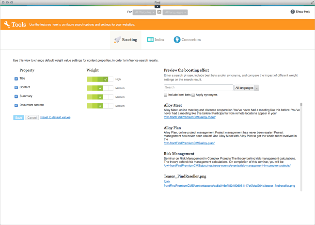 For those of you who would like more control of the relevance and the ranking profiles, we now make it possible to configure the weights for the individual content properties. This is done right inside the administration interface. Please note that this affect the ranking significantly – "with great powers comes great responsibility".