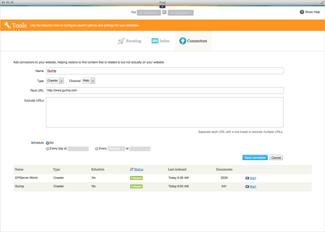 We are now introducing a new way of getting your site indexed. As a complement to pushing items to the index, it is now possible to use a crawler to index your content. We are doing this through our connector framework and we're calling it "Find Connections". From the get-go, we will have a web crawler and a RSS feed crawler available – these are perfect if for instance you want to crawl an external blog site. In the future it is likely that we will add several more connectors to the list.