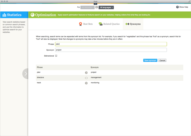 Talking about optimizations, we now offer new capabilities to further enhance the search experience on your site. Synonyms is a feature that has been requested for a long time and it is now available. It is possible to add both plain and bidirectional synonyms.