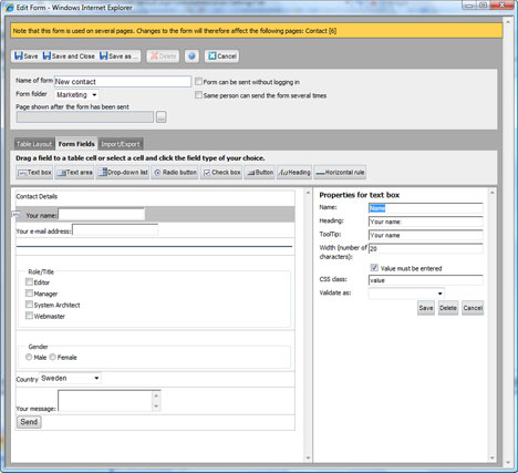 The Forms Editor has been redesigned and now also supports both Firefox and Internet Explorer. The new design supports your work efficiently and you are now, for example, able to indicate which option should be preselected in a check box, radio button or drop-down list. You can also create more structured forms by dividing the form using horizontal rules.