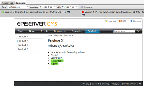 In EPiServer CMS 6 you will find extended possibilities for comparing versions of a page to identify changes.