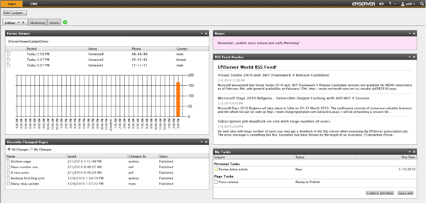 A gadget is a small application that can be customized and placed on your dashboard. It can be for instance a listing of your tasks, a personal note or the monitoring of registrations to an event through a form. EPiServerver CMS 6 comes with eight sample gadgets, but you can also develop your own gadgets.