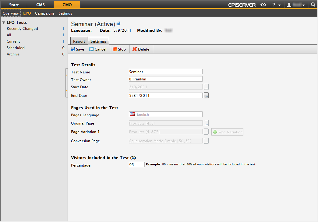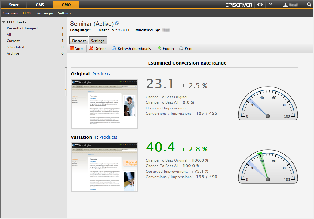 - The CMO LPO Report gadget shows current statistics to estimate which will be the winning page.