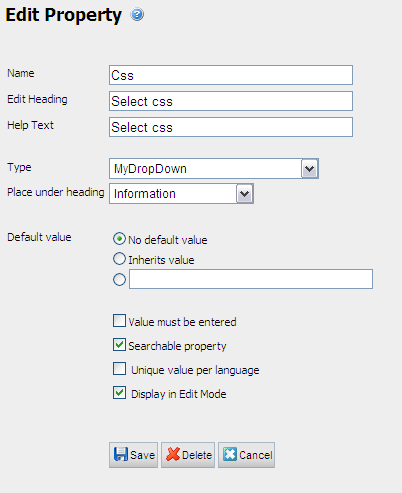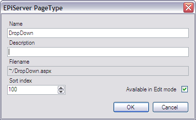 This will create two new classes in your project. The MyDropDown class that uses attributes to make sure it is plugged in to the correct tab in the EPiServer UI, this could be either the Admin or Edit mode. Almost no code is placed in this class. Instead most of the functionality is placed in the Control class, MyDropDownControl. As your classes are generated you will notice that the control class contains some usefull comments on what methods to override in order to get started. In this sample code we will override two methods, ApplyEditChanges() and CreateEditControls().