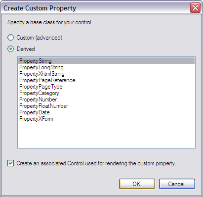 A dialog will pop up on the screen asking you if you want to create the property as Custom or Derived. Check the Derived radio button and select PropertyString as base class (also make sure that the option "Create an associated Control used for rendering the custom property" is checked).