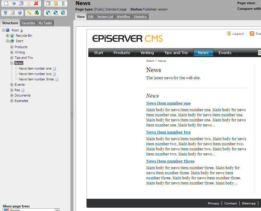 To make it easier for news editors, it is common to have a specific "News item" page template, as in the standard templates of EPiServer CMS 5. This template is defined so that it is automatically hidden in the menu. It also has an introduction field, where you can enter a short text that will be displayed in the listing. The main body text will only be displayed when you click the actual news item. You can also change the page type settings so that under the "News" container page, it is only possible to create pages of type "News items". This way you can make life easier for the editors, which after all is what EPiServer CMS is all about!