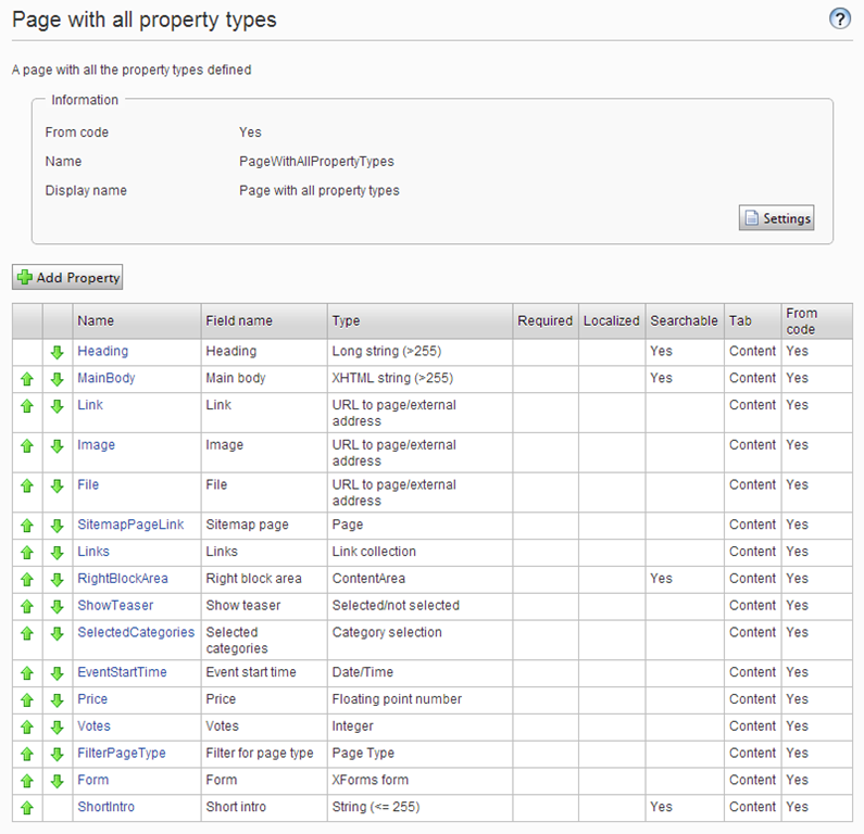 | Required | Defines if a value for this property must be set before being able to save a page of the parent type. If not set: false. |