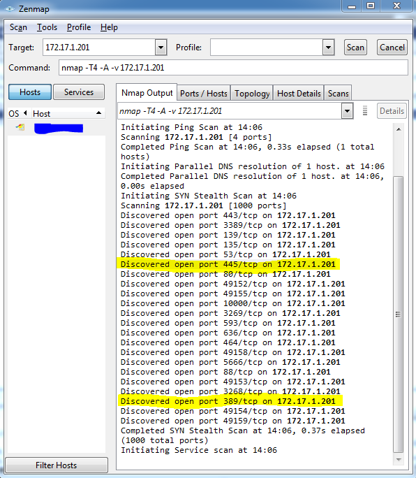 Insert your server adress at the top and hit scan. This will display a list of open ports that you can connect to on that server. The important ones that needs to be open for ActiveDirectoryMembershipProvider I’ve marked in yellow. They are 389 and 445 and yes, you need both of them.