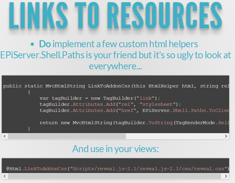 9. Of course you can add nicely styled code blocks to your presentation. Copying code from images isn’t very fun…just use the “code” html tag in html view of content and the javascript will take care of the rest. Check out demo for example slides with code blocks ![]()