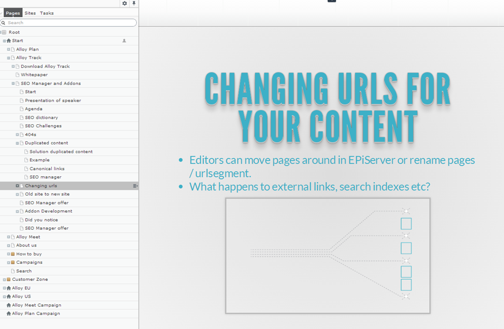 I took a trip to London in November to hold a small presentation about developing addons for EPiServer at the EPiServer developer track. But what better way to describe developing addons than to do the actual presentation as an EPiServer addon? Why not create your presentation directly in your favorite tool EPiServer instead of the boring Powerpoint and have it up and running online directly for all to see, including slides with movie clips etc. Every slide is a page in EPiServer as below for my demo presentation: