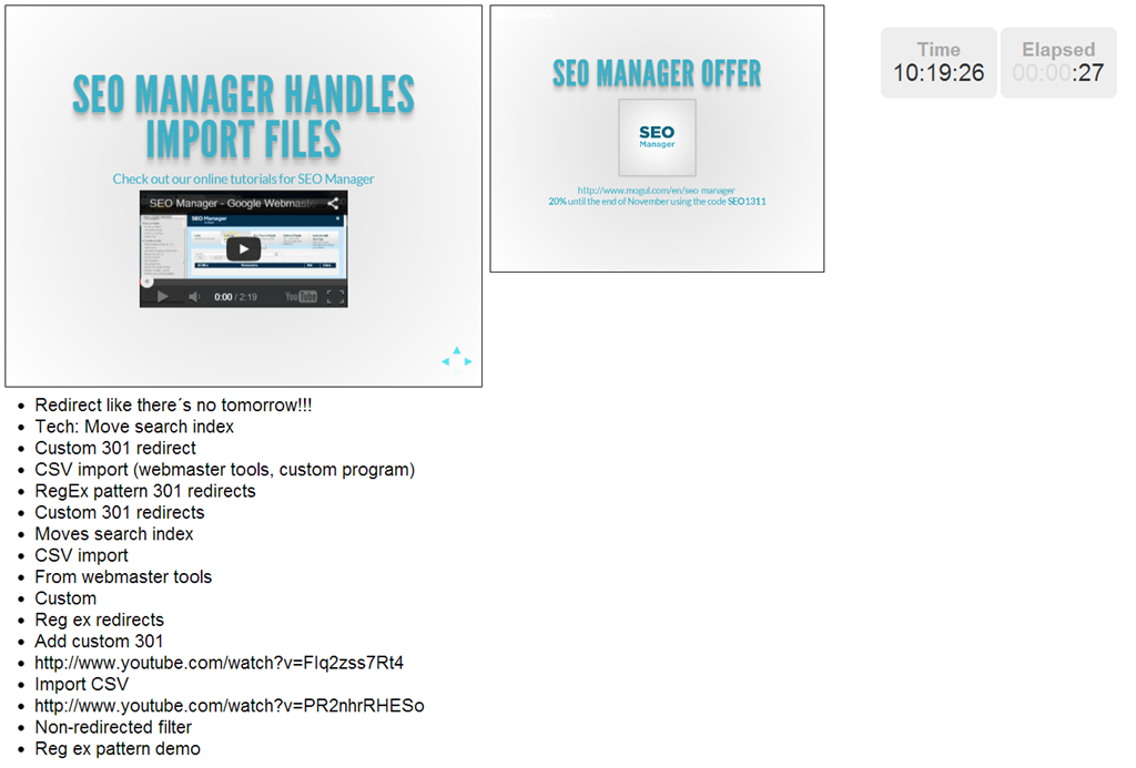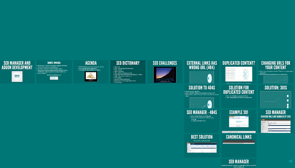 The demo presentation is about common pitfalls and similar when developing addons and also about SEO and the SEO manager addon in specific.