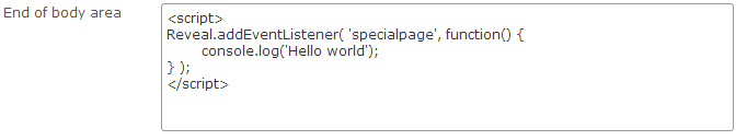 6. For those that really want to dive in and customize it there is also a property called “Custom page id” that can be set per slide. This can be used to identify slides to target them for both css and javascript per slide. The Custom page id is set as a class on the html element when a slide is active as well as throwing a javascript event that can be used to add custom behaviour like starting a video, adding custom animations etc. Below is an example of writing a log message when the slide with id = “specialpage” is active. There are properties available to insert whatever you like to both header area and at the end of body area to let creative developers modify what ever you like. ![]()