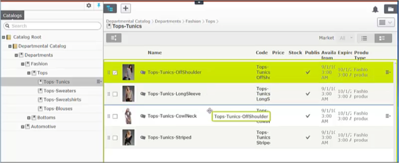 In the Catalog Manager UI, a new "sort mode" feature lets you change the sort order (the ranking) of items in a category. After clicking the sort mode button, you select one or more items then drag and drop them to the new location. This position is independent for each category association.