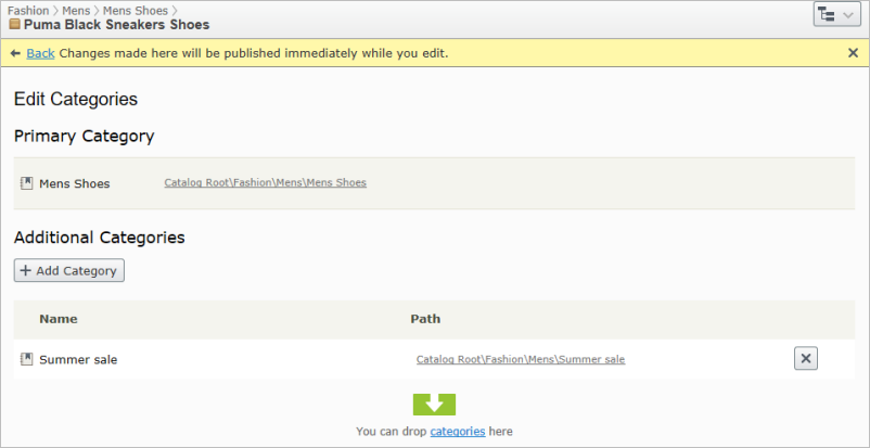 For each catalog entry, you can now assign one primary category and any number of additional categories. They appear on the product's "Categories" and "Belongs to" views.