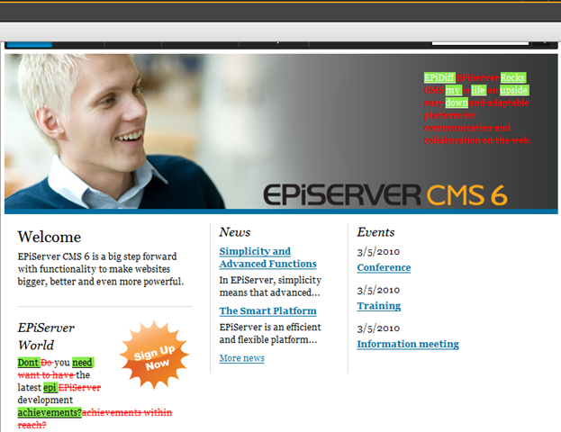 string providerName = "TestProvider"; ProviderSettings providerSettings = new ProviderSettings(providerName, "EPiServerUnitTest.EPiDiff.TestProviders.TestProvider, EPiServerUnitTest"); providerSettings.Parameters.Add("AnalyzeTextBasedOnTheseBlocks", "p; span; div"); DiffComparerProviderBase diffComparerProvider = DiffComparerProviderBase.CreateInstance(providerSettings);We hope that this feature will be used and is appreciated by our editors. We are constantly trying to improve this algorithm and find new ways of showing changes made such as image changes and dynamic content changes.