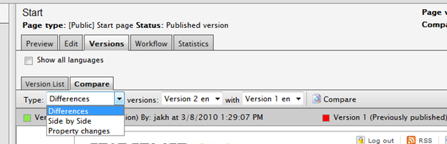 In CMS 6 a new editorial feature is available making it easier to compare versions in EPiServer. When listing versions there is a new tab showing three different compare options. Compare the old way, side by side, compare properties also side by side and merge using EPiDiff and highlight changes. We hope that these three options will make it easier for editors to be able to see changes in their documents and be able to track changes easier.