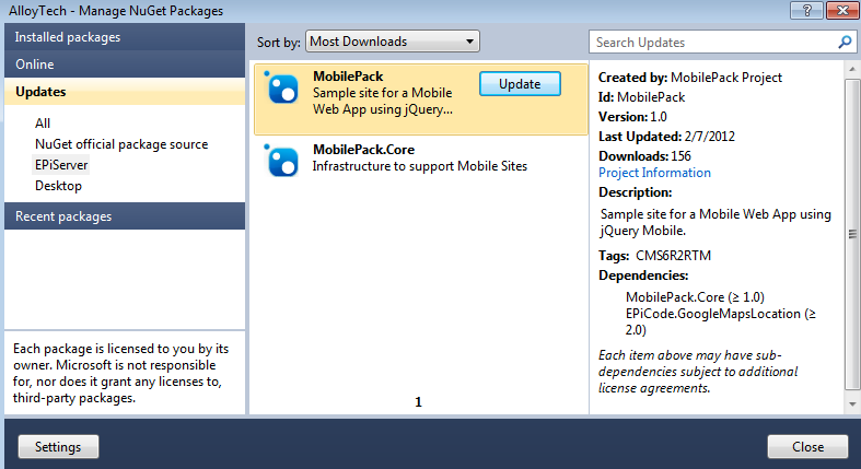 To upgrade from 0.9 to 1.0 is very easy and can be done in two steps. Since the EPiServer.Labs.MobilePack.Core is a separate project we can simply choose to only upgrade the Core and utilize the new features without affecting our templates.