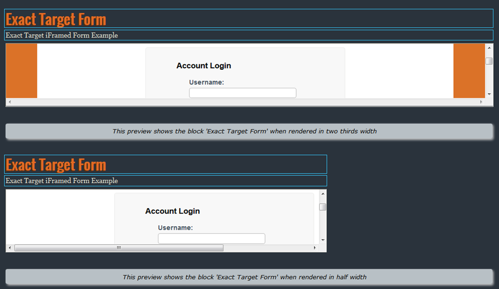 Granted, this is not a real world scenario since I’m actually iFraming in a login page for Exact Target’s member site, I think it illustrates the point of the possibilities for usage.