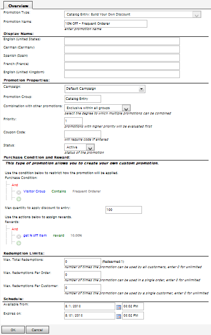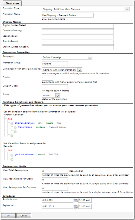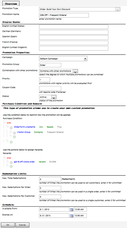 - Finish configuring the promotion and select the “OK” button to save. My example promotions entire definition can be seen below.