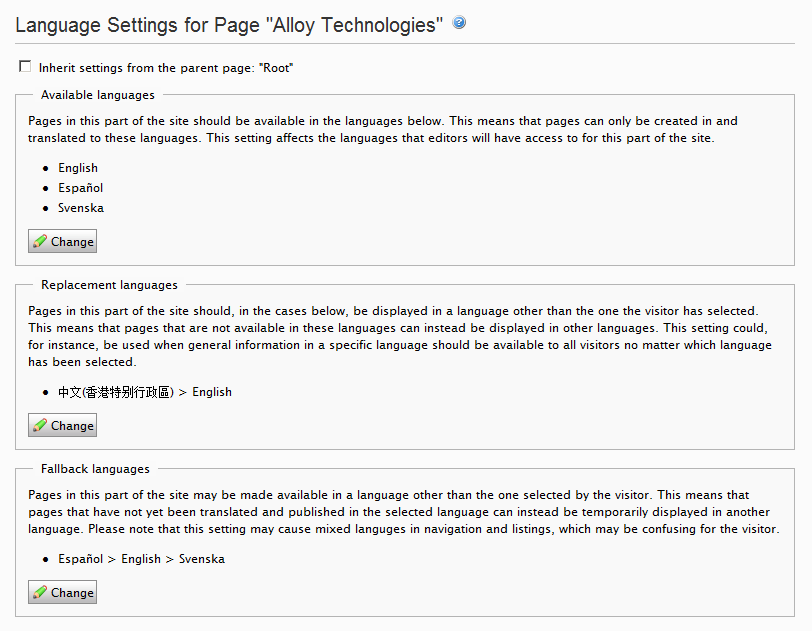 Administrators can specify which language variations can be created by content contributors, fallback languages that are to be displayed if the requested language variation does not exist, and replacement languages that are to override a specific language variation.