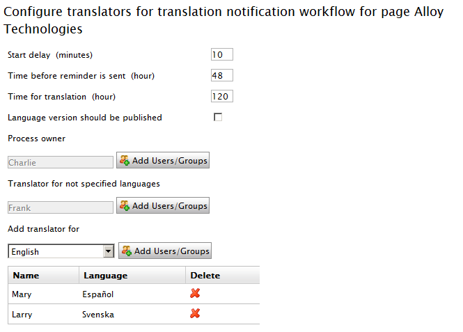 The "Ready for Translation" workflow reminds workflow participants to perform translations after a configurable interval and sends a final alert after a configurable interval to inform persons/groups if a page was not fully translated. This workflow can be configured to automatically start when the default language variation is changed and to assign translation activities to a unique translator for each variation.