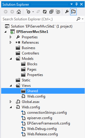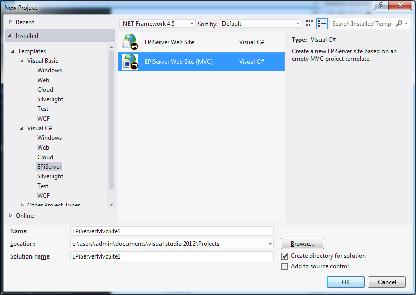 - File > New Project… > Installed > Templates > Visual C# > EPiServer > EPiServer Web Site (MVC)