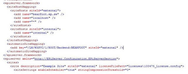 Here you can see that the host mapping configuration has been moved from site element in episerver section to siteHostMapping element in episerver.framework section. You can also see that there is a new attribute licenseFilePath on site element that states where the license file associated with the site should be loaded from. The path can be either relative to the site root or an absolute physical path. The system will by default (e.g. when downloading license files) store them in a sub folder to the site called “Licenses”.