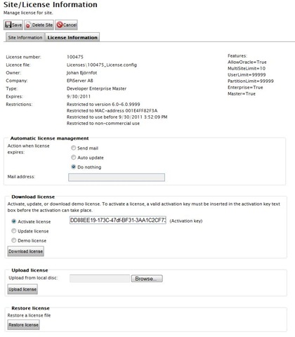 - “Active license” – When an activation key has been recieved from the EPiServer license system (e.g. by an email) this feature can be used to download the license file. So in this case you type in the received activation key and press “Download”. CMS will then make a call to the license service with the passed in activation key and (given that is a valid activation key) receive the license file and update the system to use the received file.
