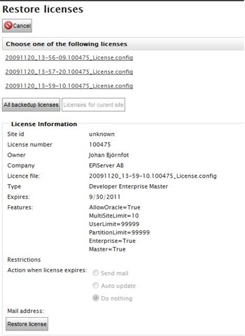 The “Restore license” section makes it possible to “rollback” and use a previously backed-up license file (the system will whenever it updates a license file take a backup of the current license file). If you click on the “Restore license” button you will see the page below: