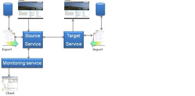 In the picture above the source and target services runs in separate processes outside the web site application. Both source and target services are instances of MirroringService which we have chosen to implement as an IIS hosted WCF service. However the services have no dependency to web context so it would be easy to host them for example in a Windows Service instead.