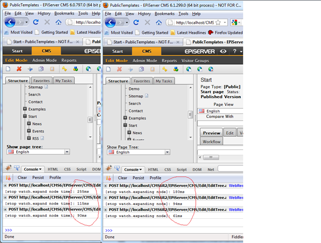 Below are some comparison figures between CMS6 and CMS6R2 that compare the time to expand nodes in the edit tree. In my test I used a structure with ~1000 pages on two languages. I ran the test by first resaving web.config (to empty the cache) and then expand nodes in the tree and measuring the time for the ajax request to get the child nodes. The test shows that the new implementation returns around 20% faster.
