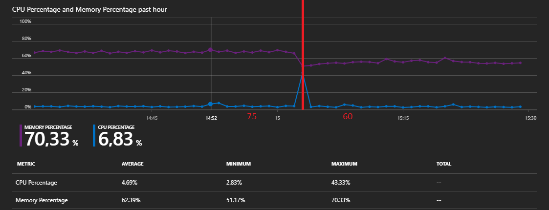 I then started experimenting with different cache settings. I first tried percentagePhysicalMemoryUsedLimit setting of 50 and observed the same issue as we had seen before - the setting seemed to be ignored and it behaved like the default configuration, using up the memory and getting recycled. I then tried a setting of 40, and the behavior was completely different, it indeed seemed to limit the memory usage to about 40 %. WTF?