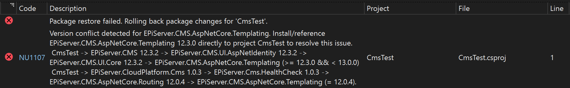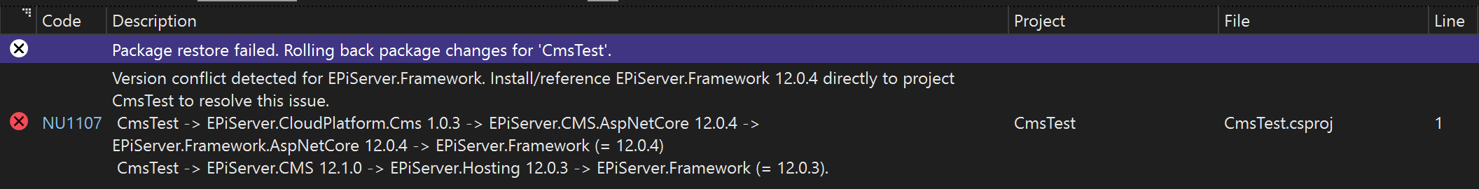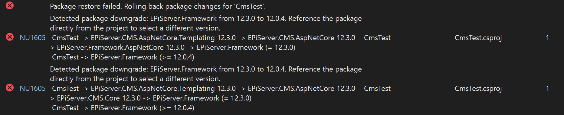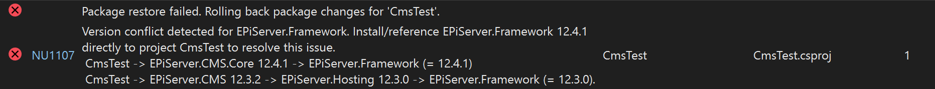 When you used to update something like the umbrella package EPiServer.CMS in the old packages.config world, nuget would also update (overwrite) all its dependencies, e.g. EPiServer.Framework. This is not the case with PackageReference. While transitive dependencies are implicit, direct dependencies are taken very explicitly. Sadly this can cause problems when updating a higher level package like EPiServer.CMS. Let's start from the state in the step before, and try to update EPiServer.CMS to 12.3.2, the latest version at the time of writing.