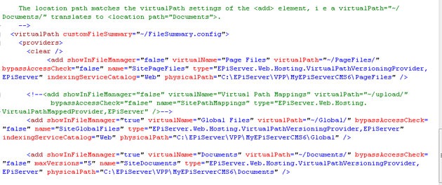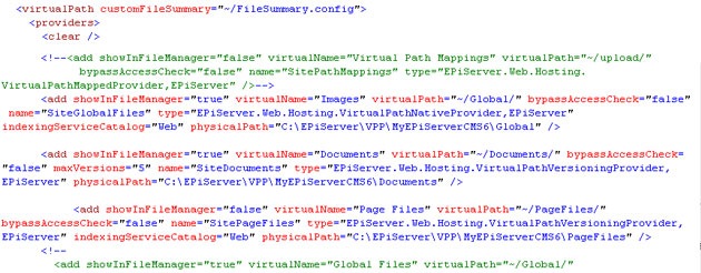 The management of the various folders in the file is episerver.config (CMS 6) or web.config (CMS 5). Maybe not a file that anyone should be wasting in but I want this just to show how with a little cutting and pasting may not have to ask if I want to create a folder every time I open the file manager. The file is a part for the Virtual Path Provider. Where are all the folders that are handled by the system, regardless of whether they are visible to editors or not. Below is an extract from the file episerver.config.