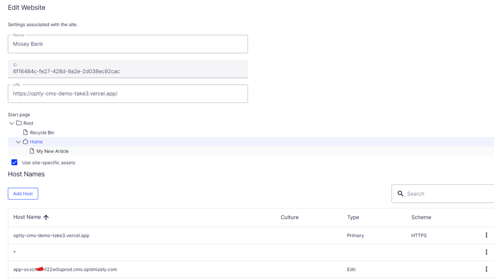 My next steps were to try and get the On Page Editing aspect of the CMS working for this I had to set the Hostnames up correctly within Manage Websites, my Edit Host is the SaaS CMS and Primary Host is the Vercel Front end i.e.
