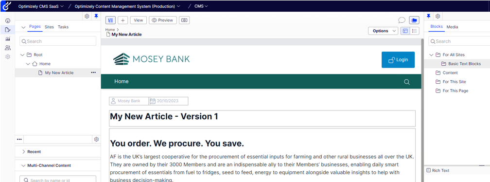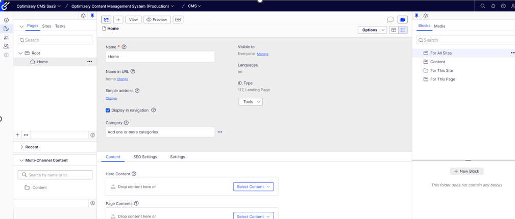 With my homepage loading I decided to add some content to the content area like a simple Rich Text Block into the Main Content Area, initially I created this as an Inline Block which did not work, the template or graph currently cant handle this and it is something Optimizely are working on rectifying. Having changed the Inline Block to a Shared Block the content was rendering just fine on my Homepage.