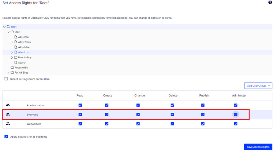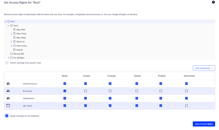 Having got this far and sucessfully being able to generate a bearer token, we have to grant our newly created client permissions to create and publish content, we do this by managing access rights in Optimizely. Remove additional rights given to the "Everyone" group and add them to the api-client with the same rights instead.