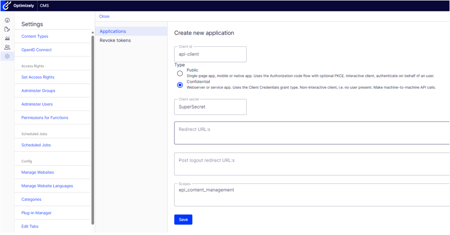 services.AddContentManagementApi(OpenIDConnectOptionsDefaults.AuthenticationScheme, options => { options.DisableScopeValidation = true; }); services.AddOpenIDConnect<ApplicationUser>( useDevelopmentCertificate: true, signingCertificate: null, encryptionCertificate: null, createSchema: true ); services.AddOpenIDConnectUI(); - After saving the file, build and run the solution and access Optimizely Admin mode. Look for "OpenID Connect" in Settings, create a new application (set Scopes as "epi_content_management").