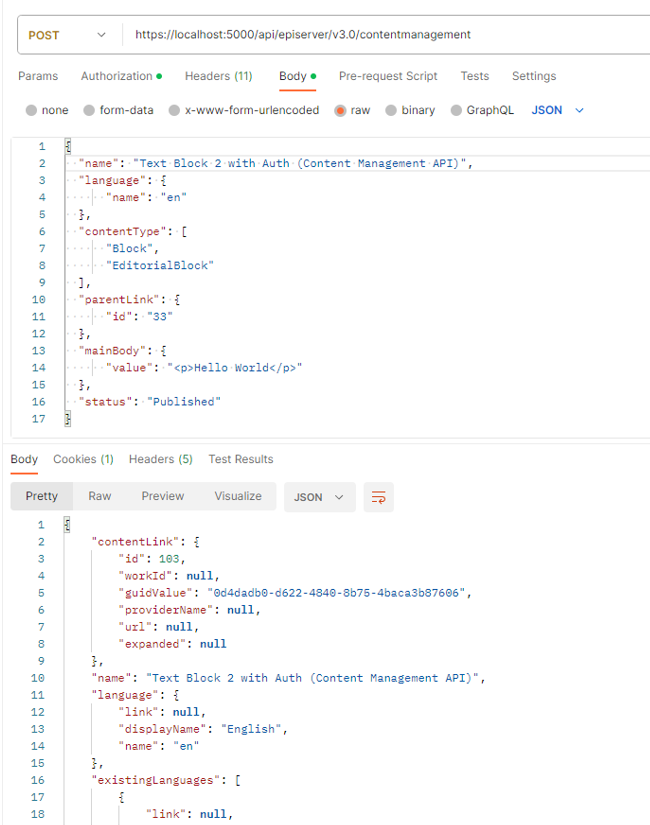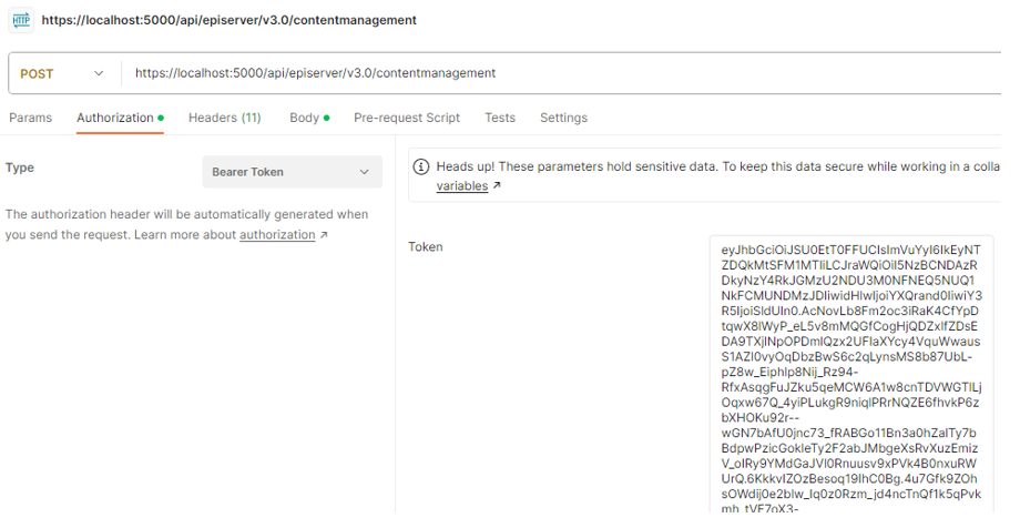Finally, copy the access token from Postman and make another POST request to /api/episerver/v3.0/contentmanagement, this time also setting the Authorization Token.