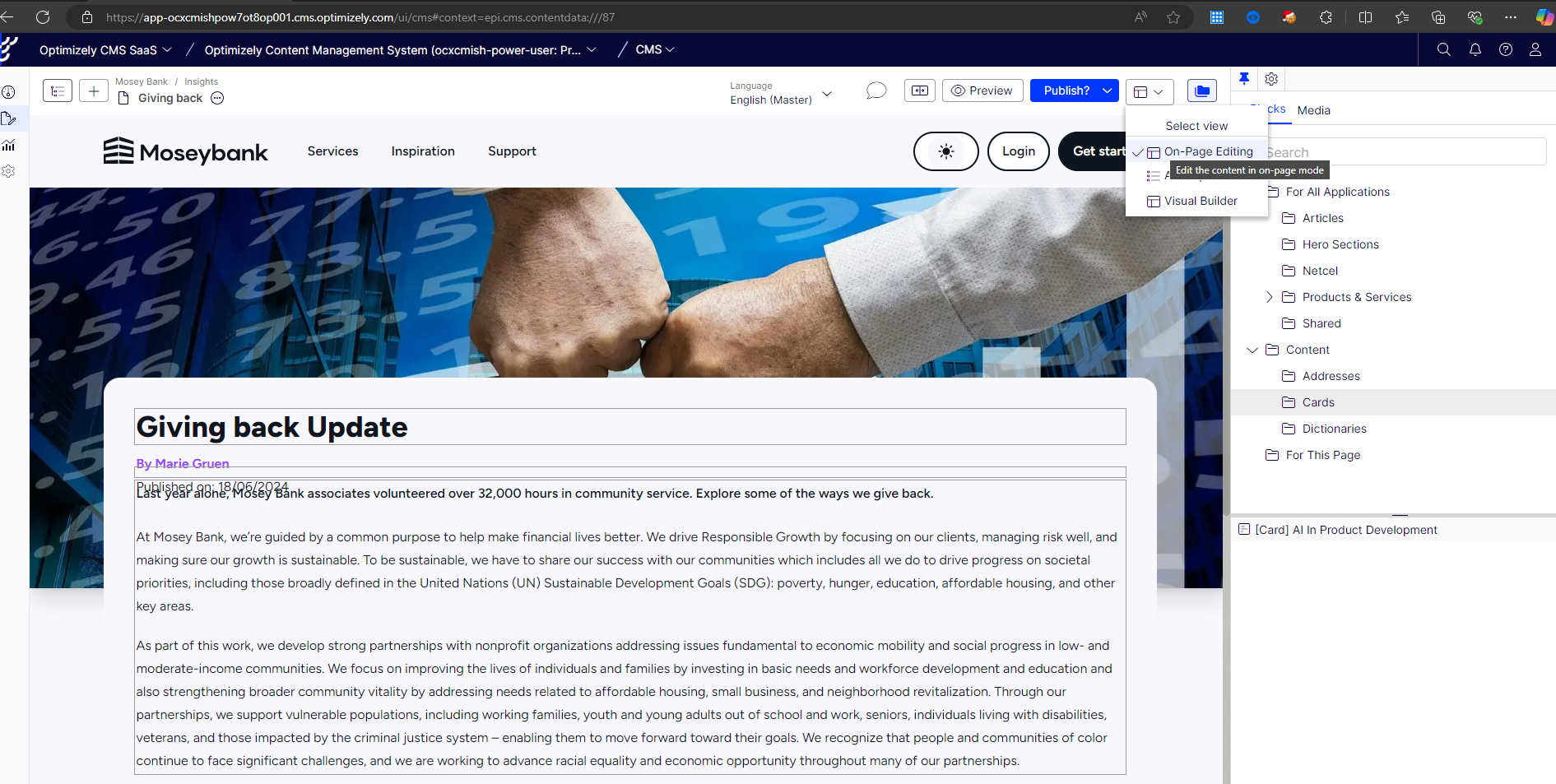 I’m thrilled to see that Optimizely has now enabled Visual Builder for OG Pages and Blocks within SaaS CMS, and I’m guessing this will become standard for CMS13. Previously, Visual Builder was only available for Experiences, forcing us to revert to traditional on-page editing which was somewhat clunky or use the "All Properties" view, which didn’t provide a great preview experience.