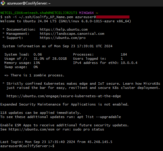 Once my virtual machine was configured, I made an SSH connection. You can connect either via the Azure Portal or using your favorite terminal.